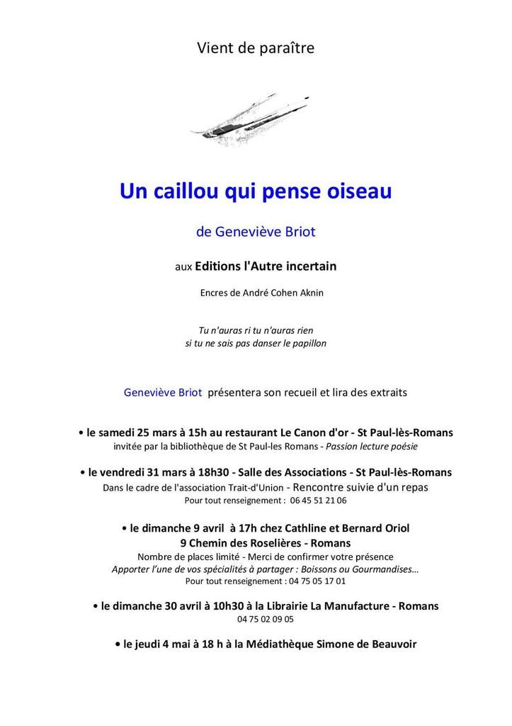 Parution Un caillou qui pense oiseau de Geneviève Briot Publié le 23 mars 2017 par Irène Mon recueil Un caillou qui pense oiseau vient de paraître.Aurai-je le plaisir d'échanger avec vous lors de l'une de mes lectures ? Geneviève BRIOT04 75 02 61 93genevievebriot@orange.frhttp://briot-cohenaknin.hautetfort.com/ Publicité