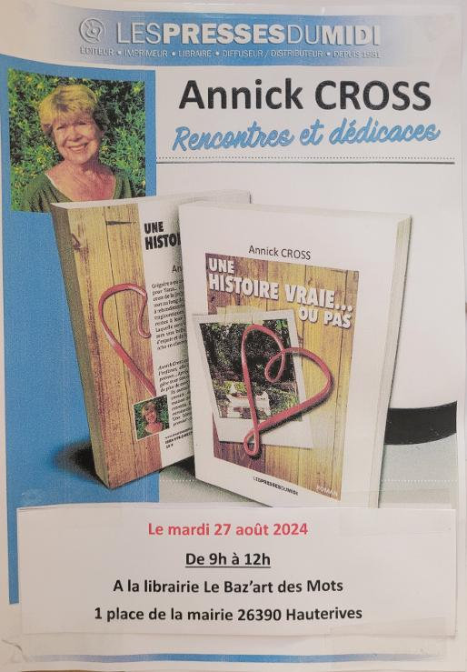 Mardi 27 août de 9h à midi : Rencontre, dédicace avec Annick Cross au BAZ'ART DES MOTS à Hauterives Publié le 22 août 2024 par Irène Mardi matin 27 AOUT Publicité